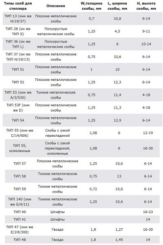Рассмотренными разновидностями расходники, используемые при работе со скобострелами, не ограничиваются. В таблице ниже приведены встречающиеся крепежи для мебельных скобострелов с их описанием и типоразмерами.